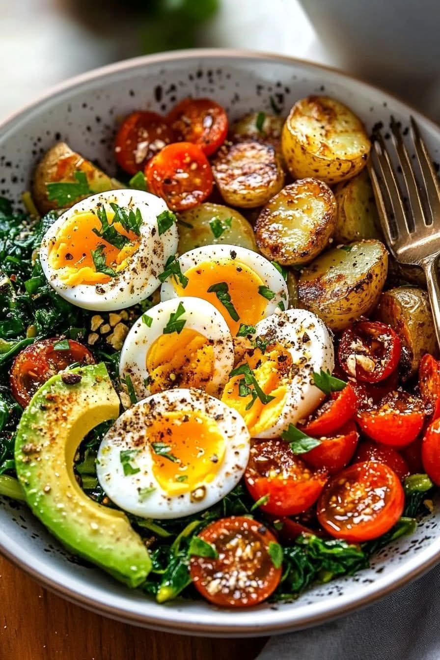 Bowl santé aux œufs, pommes de terre et légumes